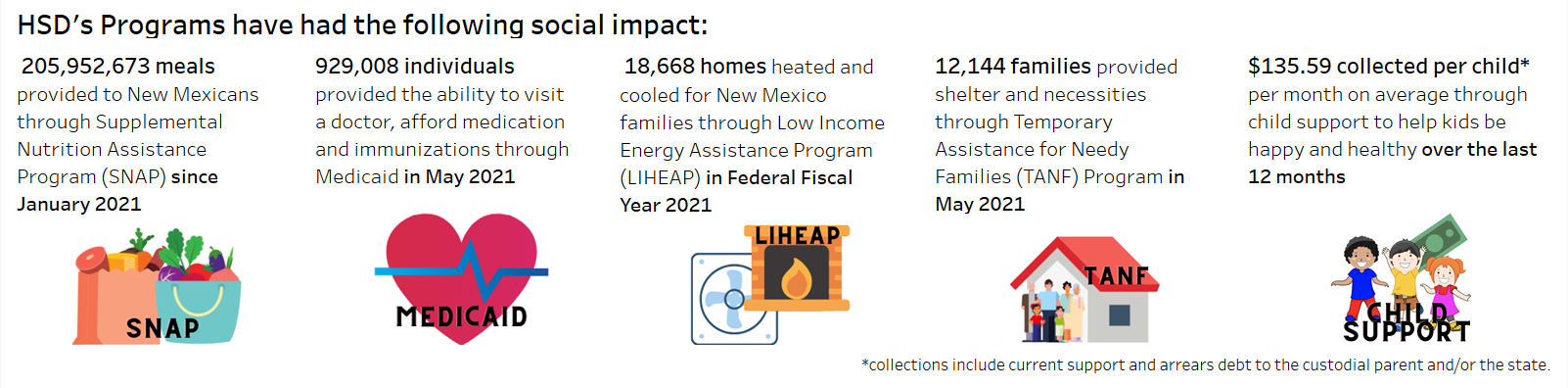The Human Services Department provides services and benefits to 1,100,445 New Mexicans through several programs including Medicaid, Temporary Assistance for Needy Families (TANF), Supplemental Nutrition Assistance Program (SNAP), Child Support, and several Behavioral Health Services.